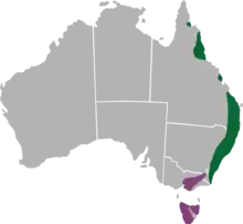 The Macleay's swallowtail is one of the most widely distributed swallowtail butterflies in Australia.[8] It is found in eastern Australia including the ACT, New South Wales, Queensland, Victoria and Tasmania. It is the only swallowtail found in Tasmania.[9] The species has also been found on Lord Howe Island and Norfolk Island, but not since 1893.[1] The habitat of the species includes urban areas, forests, woodlands and heath.[10]