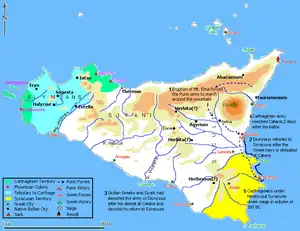 The Phoenicians had established trading posts all over the coast of Sicily after 900 BC, but had never penetrated far inland. They had traded with the Elymians, Sicani and Sicels and had ultimately withdrawn without resistance to Motya, Panormus and Soluntum in the western part of the island when the Greek colonists arrived after 750 BC.[1] These Phoenician cities remained independent until becoming part of the Carthaginian hegemony some time after 540 BC.[2]