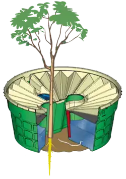 The Groasis waterboxx is a polypropylene bucket with a lid.[5] It has a vertical tunnel in the middle for two plants. A wick allows water from inside the box to trickle into the ground via capillary action. The device mimics the insulating effect bird feces provide to germinating seeds.[6][7] The box's lid is covered by tiny papillae, which create a superhydrophobic surface due to the lotus effect. The lid serves to funnel even the smallest amount of water down siphons into the box's central reservoir.[8][9]