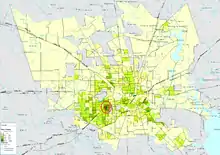 By 2000, many Gulfton residents had recently immigrated from Mexico or other Latin American countries.[56] In 2000 the super neighborhood reported a population of 46,369 people, of whom 34,410 (74%) were Hispanic, 5,029 were white, 4,047 were black, 2,081 were Asian, 61 were Native American, 13 were Native Hawaiian, and 97 were of other races and were not Hispanic. 631 were of two or more races.[57] As of 2010, Gulfton has citizens of 82 countries, and 16 languages are spoken in the community. Gulfton had a density of 16,000 people per square mile, while as a whole the area within the 610 Loop has a density of 3,800 people per square mile.[58]