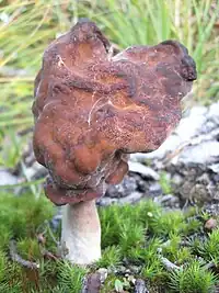 Gyromitra infula, commonly known as the hooded false morel or the elfin saddle, is a fungus in the family Helvellaceae. The dark reddish-brown caps of the fruit bodies develop a characteristic saddle-shape in maturity, and the ends of both saddle lobes are drawn out to sharp tips that project above the level of the fruit body. The stipe is white or flushed pale brown, smooth on the outside, but hollow with some chambers inside. It is found in the Northern Hemisphere, usually in the late summer and autumn, growing on rotting wood or on hard packed ground. G. infula is considered inedible as it contains the toxic compound gyromitrin which, when metabolized by the body, is converted into monomethylhydrazine, a component of some rocket fuels. The toxin may be removed by thorough cooking. Gyromitra fungi are included in the informal category "false morels".
