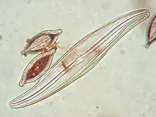 Like other diatoms, Gyrosigma has a siliceous cell wall called a frustule. The frustule is composed of two sections called valves, with one valve fitting inside the other valve similar to the two halves of a Petri dish.[2] Gyrosigma has valves with a central slit called a raphe, which allows the diatom to move.[3]