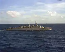 A twin launcher for the Seaslug anti-aircraft missile was fitted aft.[6] The Seaslug GWS1 was a beam riding missile which had an effective range of about 34,000 yd (31 km).[7] Up to 39 Seaslugs could be carried horizontally in a magazine that ran much of the length of the ship.[8][9] Close-in anti-aircraft protection was provided by a pair of Seacat missile launchers, while two twin QF 4.5 inch Mark V gun mounts were fitted forward. A helicopter deck and hangar allowed a single Westland Wessex helicopter to be operated.[2]