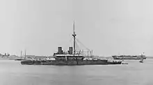 The Devastation class was designed as an enlarged, ocean-going, version of the earlier Cerberus-class breastwork monitor.[1] The ships had a length between perpendiculars of 285 feet (86.9 m) and were 307 feet (93.6 m) long overall. They had a beam of 62 feet 3 inches (19.0 m), and a draught of 26 feet 8 inches (8.1 m). The Devastation-class ships displaced 9,330 long tons (9,480 t). Their crew consisted of 358 officers and ratings. They proved to be steady gun platforms and good seaboats, albeit quite wet forward. Their low forecastle caused them problems with head seas and limited their speed in such conditions.[2]