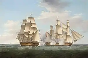 On 9 March 1797 the British frigates HMS St Fiorenzo and HMS Nymphe spotted two French ships while returning from a reconnoitre of Brest.[27] These ships were the 40-gun frigate Résistance and 22-gun corvette Constance.[28] The two ships were attempting to return to France after participating in the landing of French troops at Fishguard on 22 February.[27] St Fiorenzo and Nymphe quickly engaged the ships, despite the French Brest fleet being just over the horizon, first attacking Résistance which soon surrendered, followed around ten minutes later by Constance.[28] At the close of the action, which would see Résistance purchased into the navy as Fishguard, Triton hove into sight alongside the ship-of-the-line HMS Robust; it has been suggested that the arrival of Triton and Robust facilitated the quick capture of the two French ships, however they did not play any part in the action itself.[Note 8][28] Triton was more successful in reaching action after this, capturing the trader La Zoes on 12 June while sailing with a number of Warren's ships, and Boston on 25 July, now with a different part of the squadron.[Note 9][30][32][31][33]