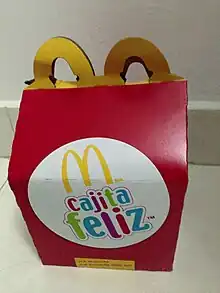 A Happy Meal is a kids' meal usually sold at the American fast food restaurant chain McDonald's since June 1979.[1] A small toy or book is included with the food, both of which are usually contained in a red cardboard box with a yellow smiley face and the McDonald's logo. The packaging and toy are frequently part of a marketing tie-in to an existing television series, film or toyline.