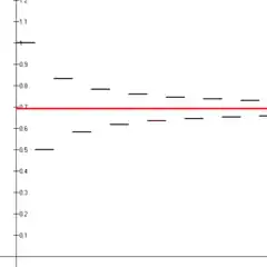 The first fourteen partial sums of the alternating harmonic series (black line segments) shown converging to the natural logarithm of 2 (red line).