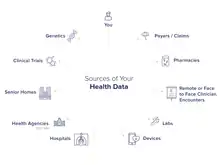 Prior to recent technological advances, most health data were collected within health care systems. As individuals move through health care systems, they interact with health care providers and this interaction produces health information. These touch points include, clinics/physician offices, pharmacies, payers/insurance companies, hospitals, laboratories, and senior homes. Information is also collected through participation in clinical trials, health agency surveys, medical devices, and genomic testing. This information, once recorded, becomes health data. This data typically includes a record of services received, conditions of those services, and clinical outcomes consequent of those services.[2] For example, a blood draw may be a service received, a white blood cell count may be a condition of that service, and a reported measurement of white blood cells may be an outcome of that service. Information also frequently collected and found in medical records includes, administrative and billing data, patient demographic information, progress notes, vital signs, medications diagnoses, immunization dates, allergies, and lab results.[6]