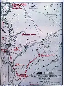 A joint Ottoman-German force attacked a weak point of the British line in the Jordan Valley on 14 July at the Battle of Abu Tellul, being defeated by a counter-charge by the ANZAC Mounted Division.[53] While this attack was ongoing an Ottoman force of 1,200 cavalry made contact with two of Macandrew's regiments, based between Ghorniye and the Dead Sea. With the British on the other side of the River Jordan to the Turkish force, Brigadier-General Cyril Harbord of the 15th suggested to Macandrew that his two regiments, the Mysore and Jodhpore Lancers, could attack the Ottomans in a pair of flanking manoeuvres. This Macandrew agreed to.[53][54]