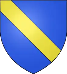 One of the earliest known examples of armory as it subsequently came to be practiced can be seen on the tomb of Geoffrey Plantagenet, Count of Anjou, who died in 1151.[22] An enamel, probably commissioned by Geoffrey's widow between 1155 and 1160, depicts him carrying a blue shield decorated with six golden lions rampant.[lower-roman 2] He wears a blue helmet adorned with another lion, and his cloak is lined in vair. A medieval chronicle states that Geoffrey was given a shield of this description when he was knighted by his father-in-law, Henry I, in 1128; but this account probably dates to about 1175.[23][24]