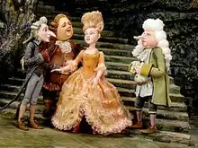 Tatiana Lykosov was the puppet animation director.[13] The papier-mâché puppet actors are constructed by a metal skeleton on hinges. In order to convey expression onto the puppets it was necessary for the animator to understand the mood of the puppet and how they behave in certain situations.[38] A report revealed the heads of the characters, express three different emotions: neutral, smiling and menacing. After sawing the head, the eyes are inserted inside made by balls that move in the same way as in a living person or a bird.[13] The animators also designed the miniaturized props for the film such as candlesticks placed on the tables, paintings hanging on the walls or the piano, sofas, and chairs.[6] The most difficult shot was the appearance of the character the Sea King who had to be depicted in smooth locomotion since the character had only a tail and no legs. The tail made of rubber with a metal hinge structure inside was attached to a coordinate table that moved through cogs.[39]