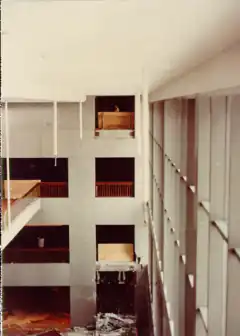 Approximately 1,600 people gathered in the atrium for a tea dance on the evening of Friday, July 17, 1981.[6] The second-level walkway held about 40 people at approximately 7:05 p.m., with more on the third and an additional 16 to 20 on the fourth.[1]: 54 The fourth-floor bridge was suspended directly over the second-floor bridge, with the third-floor walkway offset several yards from the others. Guests heard popping noises and a loud crack moments before the fourth-floor walkway dropped several inches, paused, then fell completely onto the second-floor walkway. Both walkways then fell to the crowded lobby floor.[7][8] A diner at the 42nd-floor revolving restaurant atop the Hyatt said it felt like an explosion.[9]