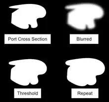 In fact, the process is even slightly more complicated because corners protruding into the combustion chamber will regress more quickly than their circular counterparts, since they are exposed to heat on both sides. To model the problem, Bath developed a technique of iteratively blurring pixels and removing those that fall below a certain threshold of brightness.[10] Using the image processing to generate a table of surface area outputs for a given volume, it can easily be implemented into a model for regression of the fuel grain over time.