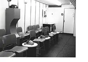 Interior of the 1970s lorry-based 3750 demonstration suite that was driven throughout France, Germany, Italy and the UK. Note the use of a slide projector and the then novelty of push-button telephones.