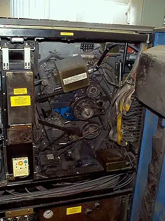 It physically resembles two IBM 1419 reader/sorters connected end to end. Only the right hand 1419 has a running board (used to hold trays of documents to be sorted) while the feed hopper of the left hand 1419 is covered by two doors.[44][45][46] While it physically has 26 pockets, second hand resellers reported it as having 25.[47][48]