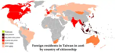 - ↑ "Foreign Residents-by Nationality". National Immigration Agency, Ministry of the Interior. 2018-11-28. Archived from the original on 2018-12-18. Retrieved 2018-12-18.
