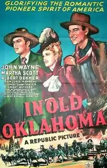 In Old Oklahoma (reissued as War of the Wildcats) is a 1943 American Western film directed by Albert S. Rogell starring John Wayne and Martha Scott. The film was nominated for two Academy Awards, one for Music Score of a Dramatic or Comedy Picture and the other for Sound Recording (Daniel J. Bloomberg).[2] The supporting cast features George "Gabby" Hayes, Marjorie Rambeau, Dale Evans, Sidney Blackmer as Theodore Roosevelt, and Paul Fix.