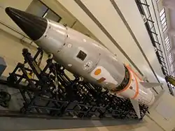 The Prithvi Air Defence (PAD) is an anti-ballistic missile developed to intercept incoming ballistic missiles outside the atmosphere (exo-atmospheric). Based on the Prithvi missile, PAD is a two-stage missile with a maximum interception altitude of 80 km (50 mi). The first stage is a Solid fuelled motor while the second stage is Liquid fuelled.[11][34] It has manoeuvre thrusters which can generate a lateral acceleration of more than 5 gs at 50 km (31 mi) altitude. Guidance is provided by an internal navigation system with mid-course updates from LRTR and active radar homing in the terminal phase.[11] PAD has capability to engage the 3,000 km (1,900 mi) class of ballistic missiles at a speed of Mach 5.[11] PAD is fast enough to hit medium-range ballistic missiles and intermediate-range ballistic missiles.
