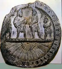 - Jain votive plaque with Jain stupa, the "Vasu Śilāpaṭa" ayagapata, 1st century CE, excavated from Kankali Tila, Mathura.[42]