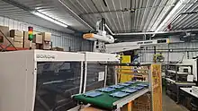A robotic arm is often used to remove the molded components; either by side or top entry, but it is more common for parts to drop out of the mold, through a chute and into a container.