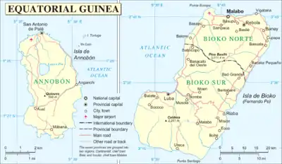 The Insular Region of Equatorial Guinea (Spanish: Región Insular de Guinea Ecuatorial, French: Région insulaire de Guinée équatoriale, Portuguese: Região Insular da Guiné Equatorial) comprises the former Spanish territory of Fernando Po, together with Annobón island, the latter formerly part of the Spanish territory of Elobey, Annobón, and Corisco, which was located in the Gulf of Guinea and in the Corisco Bay.