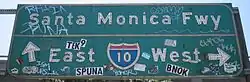 Interstate 10 (I-10) is a transcontinental Interstate Highway in the United States, stretching from Santa Monica, California, to Jacksonville, Florida. The segment of I-10 in California runs east from Santa Monica through Los Angeles, San Bernardino, and Palm Springs before crossing into the state of Arizona. In the Greater Los Angeles area, it is known as the Santa Monica and San Bernardino freeways, linked by a short concurrency on I-5 (Golden State Freeway) at the East Los Angeles Interchange. I-10 also has parts designated as the Rosa Parks and Sonny Bono Memorial freeways.[4] Some parts were also formerly designated as the Christopher Columbus Transcontinental Highway.[5] However, the California State Legislature removed this designation following the passage of a bill on August 31, 2022.[6][7] I-10 is also known colloquially as "the 10" to Southern California residents .