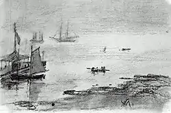 The Gosport community was fairly prosperous up until about 1778, when the islanders were evacuated to Rye, New Hampshire, due to the Revolutionary War. Though a small population remained, the islands were largely abandoned until the middle of the 19th century, when Thomas Laighton and Levi Thaxter opened a popular summer hotel on Appledore Island. Laighton's daughter, Celia, married Levi at the age of fifteen and as Celia Thaxter became the most popular American female poet of the 19th century. She hosted an arts community on the island frequented by authors including Nathaniel Hawthorne, John Greenleaf Whittier, Oliver Wendell Holmes and Sarah Orne Jewett, and the Impressionist painter Childe Hassam.[8] Having executed his last drawing three days previous, the Boston painter William Morris Hunt drowned there in 1879, reportedly a suicide.[9] Hunt's body was discovered by Celia Thaxter.[10]