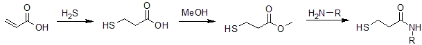 Isothiazolinones can be prepared on an industrial scale by the ring-closure of 3-mercaptopropanamides. These in turn are produced from acrylic acid via the 3-mercaptopropionic acid: