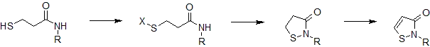 Ring-closure of the thiol-amide is typically effected by chlorination[2] or oxidation of the 3-sulfanylpropanamide to the corresponding disulfide.[3]
