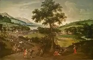 Jacob’s extant pictures show explicit connection to the region around Antwerp.[8] Some of his views of Antwerp adhere to the "town-and-country" format, a kind of combination of a rural view with a city view. An example is his panoramic View of the Kiel (1578, Royal Museum of Fine Arts Antwerp) where the city appears only on the far-right distance. Another example is the View of the Scheldt near Antwerp (1587, Royal Museum of Fine Arts Antwerp), which depicts a somewhat different aspect of country pastimes. Only in the distant horizon are the towers of Antwerp visible.[13]