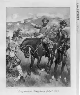 Postbellum criticism of Longstreet claims that he was ordered by Lee to attack in the early morning and that his delays were a significant contributor to the loss of the battle.[117] Early and William N. Pendleton testified that Lee had ordered Longstreet to attack at sunrise and that Longstreet disobeyed. This claim was factually untrue and denied by Lee's staff officers Walter H. Taylor and Charles Marshall.[168] Lee agreed to the delays for arriving troops and did not issue his formal order for the attack until 11 A.M. Longstreet did not aggressively pursue Lee's orders to launch an attack. Sorrel writes that Longstreet, unenthusiastic about the attack, displayed lethargy in bringing his troops forward. While Lee expected an attack around noon, Longstreet was not ready until 4 P.M. Meade used the time to bring more of his troops forward.[169][170][171] Campaign historian Edwin Coddington presents the approach to the federal positions as "a comedy of errors such as one might expect of inexperienced commanders and raw militia, but not of Lee's 'War Horse' and his veteran troops".[172]
