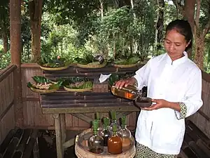 Jamu (Javanese: ꦗꦩꦸ, romanized: jamu; Sundanese: ᮏᮙᮥ; Balinese: ᬚᬫᬸ; Madurese: jâmo) is a form of traditional medical practice drawn from traditional medicines in the Indonesian island of Java (and to larger extent also including Bali and Madura), originally and culturally rooted from the Javanese herbology.[1] Traditionally, Jamu used as the medicinal remedy in a form of concoction juice to treat common ailments and boost the immune system to prevent illnesses.[1] Various spices are boiled and mixed for the medical properties, predominantly herbal medicine made of natural resources (both plant and animal-based); such as roots, bark, flowers, seeds, leaves and fruits,[2] honey, royal jelly, milk and native chicken eggs.[1]