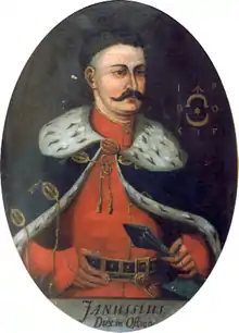 Prince Janusz Ostrogski (Lithuanian: Jonušas Ostrogiškis) (1554 – 17 September 1620 in Tarnów) was a Polish-Lithuanian noble and statesman. He served as a voivode of Volhyn (1584-1593), as a castellan of Kraków (from 1593 on), and as a starosta of Bohuslav (from 1591), Biała Cerkiew (since 1592), Czerkasy and Kaniów (from 1594), Perejasław (1604 on) and Włodzimierz.[1][2][3]