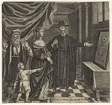 In the next year he married Phoebe Langsdale, by whom he had six children: William (d.1642), George (?), Richard (the last two died c.1656/7), Charles, Phoebe and Mary.[3] In the autumn of the same year he was appointed to preach in St Mary's on the anniversary of the Gunpowder Plot, and apparently used the occasion to clear himself of a suspicion, which, however, haunted him through life, of a secret leaning to the Roman Catholic position. This suspicion seems to have arisen chiefly from his intimacy with Christopher Davenport, better known as Francis a Sancta Clara, a learned Franciscan friar who became chaplain to Queen Henrietta; but it may have been strengthened by his known connection with Laud, as well as by his ascetic habits. More serious consequences followed his attachment to the Royalist cause. The author of The Sacred Order and Offices of Episcopacy or Episcopacy Asserted against the Arians and Acephali New and Old (1642), could scarcely hope to retain his parish, which was not, however, sequestered until 1644. Taylor probably accompanied the king to Oxford. In 1643 he was presented to the rectory of Overstone, Northamptonshire, by Charles I. There he would be in close connection with his friend and patron Spencer Compton, 2nd Earl of Northampton.