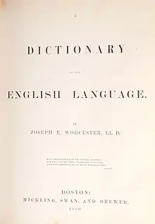 In 1860, Worcester published A Dictionary of the English Language, a substantially revised and expanded work which was soon recognized as a major English language dictionary.[11] The first copies were electrotype printed at the Boston Stereotype Foundry. The dictionary featured numerous illustrations throughout the text, a relatively new innovation. However, Worcester's work was not technically the first American dictionary to feature illustrations. Having heard about the plans for Worcester's new edition, Webster's publishers, George and Charles Merriam, rushed to put out a similar work. They managed to publish a Pictorial Edition of Webster's American Dictionary in 1859. The Pictorial Edition was basically a reprint of the 1847 American Dictionary, with engravings taken from the Imperial Dictionary of the English Language.[12] More competition arrived in the form of the Merriam's revised edition of Webster's American Dictionary, which appeared in 1864. Worcester's dictionary was posthumously revised in 1886, but was eclipsed by Webster's International and other dictionaries of the 1890s.