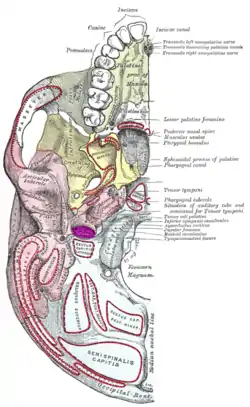![]() Base of the skull. Inferior surface. Jugular fossa labeled in purple near center. | |