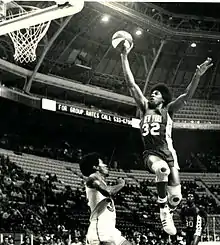 Erving recalled that "later on, in the Rucker Park league in Harlem, when people started calling me 'Black Moses' and 'Houdini', I told them if they wanted to call me anything, call me 'Doctor'".[12] Over time, the nickname evolved into "Dr. Julius" and finally "Dr. J."[13] Erving was first called "Dr. J" by his friend and future teammate on the Nets and Squires, Willie Sojourner.[14]