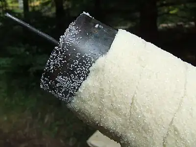 Kürtőskalács is made from sweet, yeast dough (raised dough), of which a strip is spun and then wrapped around a truncated cone–shaped baking spit, and rolled in granulated sugar. It is roasted over charcoal while basted with melted butter, until its surface cooks to a golden-brown color. During the baking process the sugar stuck on the kürtőskalács caramelises and forms a crisp, shiny crust. The surface of the cake can then be topped with additional ingredients such as ground walnut or powdered cinnamon.[5]