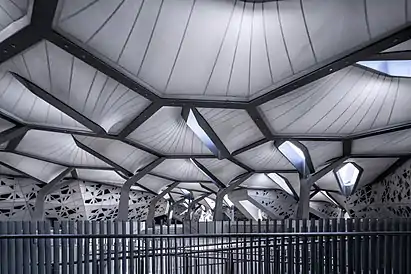 The KAPSARC campus on the northern edge of Riyadh contains both a Residential Campus (called the REC, located on the west side) and a Research and Office Complex (called the ROC, on the east side).[13] The 70,000 square meters[14] Research and Office Complex was designed by Zaha Hadid, and supported by Event Communications.[15][16] Hadid received the commission after a 2009 design competition. It opened in October 2017[17] and received a LEED Platinum certification. The complex consists of five interlocking buildings, a research center, a computer center, a conference center, a library and the Musalla, a place for prayer.[18]