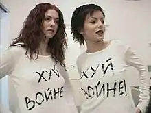 "Khuy Voyne!" (also transliterated Hui Voine, etc.; Russian: Хуй войне!, pronounced [ˈxuj vɐjˈnʲe], English translation: "Fuck war") is a phrase developed by former t.A.T.u. producer Ivan Shapovalov during the duo's promotional tour in the USA in early 2003.