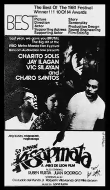 Kisapmata (Filipino for "in the blink of an eye"[1]) is a 1981 Filipino psychological horror film directed by Mike de Leon, with a screenplay by de Leon, Clodualdo del Mundo Jr., and Raquel Villavicencio. It stars Vic Silayan, Charo Santos, Jay Ilagan, and Charito Solis. The plot was inspired by the crime reportage "The House on Zapote Street" written by Nick Joaquin.[2] The piece chronicles the events leading up to the highly publicized familicide committed by Pablo Cabading, a retired policeman.[3]