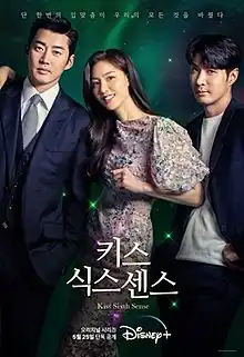 Kiss Sixth Sense (Korean: 키스 식스 센스; RR: Kiseu Sikseu Senseu) is a South Korean web series based on the web novel of the same title[4] which was made into a webtoon by Gatnyeo (Got W).[5] Directed by Nam Ki-Hoon, written by Jeon Yu-ri and starring Yoon Kye-sang, Seo Ji-hye, and Kim Ji-seok. It tells the story of Hong Ye-sool, a woman who has the supernatural ability to see the future when she is kissed, accidentally kisses her boss, Cha Min-hoo, and sees their future together. Her life gets more entangled when Ye-sool's ex-boyfriend Lee Pil-yo comes back into her life.[6] The series released two episodes every Wednesday at 16:00 (KST) from May 25, 2022, to June 29, 2022, exclusively on Disney+ in select regions.[7]
