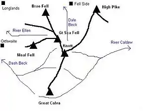 Two connecting ridges run north from Knott, separated by the deep ravines of Roughton Gill. The western arms drops across an area of bog and with little reascent arrives at the summit of Great Sca Fell. The eastern branch crosses Miller Moss and then runs at high level for two miles (three kilometres) to High Pike, first passing the subsidiary tops of Great Lingy Hill and Harestones.
