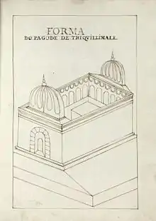 The temple's "Aayiram Kaal Mandapam" earned it the title Pagoda of Trincomalee – Temple of a Thousand Columns among Europeans.[9] The rocky promontory is dedicated to Siva in his ancient form of Kona-Ishvara, and is a major centre of pilgrimage today. The worship of Ishvara is noted to have been the original worship of the island; Charles Pridham, Jonathan Forbes and George Turnour state that it is probable there is no more ancient form of worship existing than that of Ishvara upon his sacred promontory.[7][32][33]