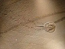 Kouphichnium is an ichnogenus that has been attributed to limulids (horseshoe crabs). Kouphichnium fossils resemble the footprints of birds, sometimes in conjunction with a medial line,[1] and were initially thought to be bird or pterosaur tracks. The footprints are now believed to be the imprints of specialized limulid appendages, called pushers, terminating in four plates, used to push against the sediment. The medial line is left by the animal's telson. This ichnogenus is registered in the Carboniferous to the Cretaceous, in marine marginal environments in Tennessee, the United States and in Poland, as well as non-marine environments of Argentina and England, among others.[2] The genus contains five species, K. arizonae, K. cordifomnis, K. lithographicum, K. minusculum and K. walchi.