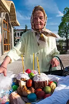Kulich[lower-alpha 1] is the Russian name for Easter bread. For the eastern Slavs, festive bread was round and tall, and dough decorations were made on top of it. The cylindrical shape of the cake is associated with the church practice of baking artos. The Paska bread tradition spread in cultures which were connected to the Byzantine Empire and is a traditional cultural part of countries with an Orthodox Christian population. It is eaten in countries like Russia, Belarus, Ukraine, Romania, Armenia, Georgia, Moldova, North Macedonia and Serbia.[4][5][6] Kulich is a variant of paska Easter breads and represents not only Easter but also the spring.[7] Easter is a very important celebration in Eastern European countries, even more important than Christmas.[8]