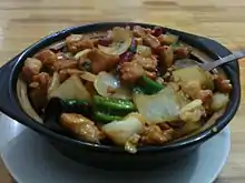 The neighboring province of Guizhou, southeast of Sichuan, has a variant of Kung Pao chicken based on the ciba fermented chili paste (Chinese: 糍粑辣椒 cíbā làjiāo) of Guizhou cuisine. And some literature even lists Guizhou as the origin of this dish.[9] Like the Sichuan version, the dish features marinated cubes of chicken; while the Guizhou marinade is largely the same as the Sichuan version's, the chicken cubes are larger and typically skin-on. The dish is further distinguished in that rather than flash-frying whole peppers in oil before stir-frying, a large quantity of the ciba chili paste is fried in the wok until the oil is stained. The chicken is then stir-fried in the resulting sauce with garlic, ginger, and green garlic or green onion.[5]