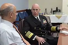 Kurt Walter Tidd[1] (born March 26, 1956) is a retired United States Navy admiral. He last served as the Commander, United States Southern Command. Prior to that assignment, Tidd served as Assistant to the Chairman of the Joint Chiefs of Staff. He also served as the Director for Operations, Joint Staff (J-3) from 2012 to 2013, and as Commander, United States Naval Forces Southern Command and United States Fourth Fleet from August 5, 2011, to June 22, 2012. Confirmed by the Senate on December 16, 2015, Tidd received his fourth star and succeeded John F. Kelly as commander of United States Southern Command on January 14, 2016. Tidd held the title of "Old salt",[2] which means he received his qualification for Surface Warfare before any other active-duty navy officer. He passed said title to Admiral Philip S. Davidson upon his retirement. Upon the May 30, 2018, retirement of his United States Naval Academy classmate, Admiral Harry B. Harris Jr., Tidd also gained the honorific of "Old Goat" – the longest-serving Naval Academy graduate on active duty. Harris presented Tidd with the Old Goat decanter in a ceremony on April 11, 2018.[3]