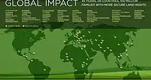 Landesa partners with governments, world leaders, NGOs, foundations, donor agencies such as the World Bank, USAID, Bill & Melinda Gates Foundation, the United Nations Food and Agriculture Organization, and others to design and implement land laws, policies and programs that provide opportunity, further economic growth, and promote social justice through land rights.[2][3]