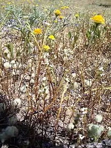 Atop the stems are inflorescences of flower heads with hairy phyllaries. The head contains many tufted yellow disc florets with a fringe of small yellow or occasionally white ray florets.